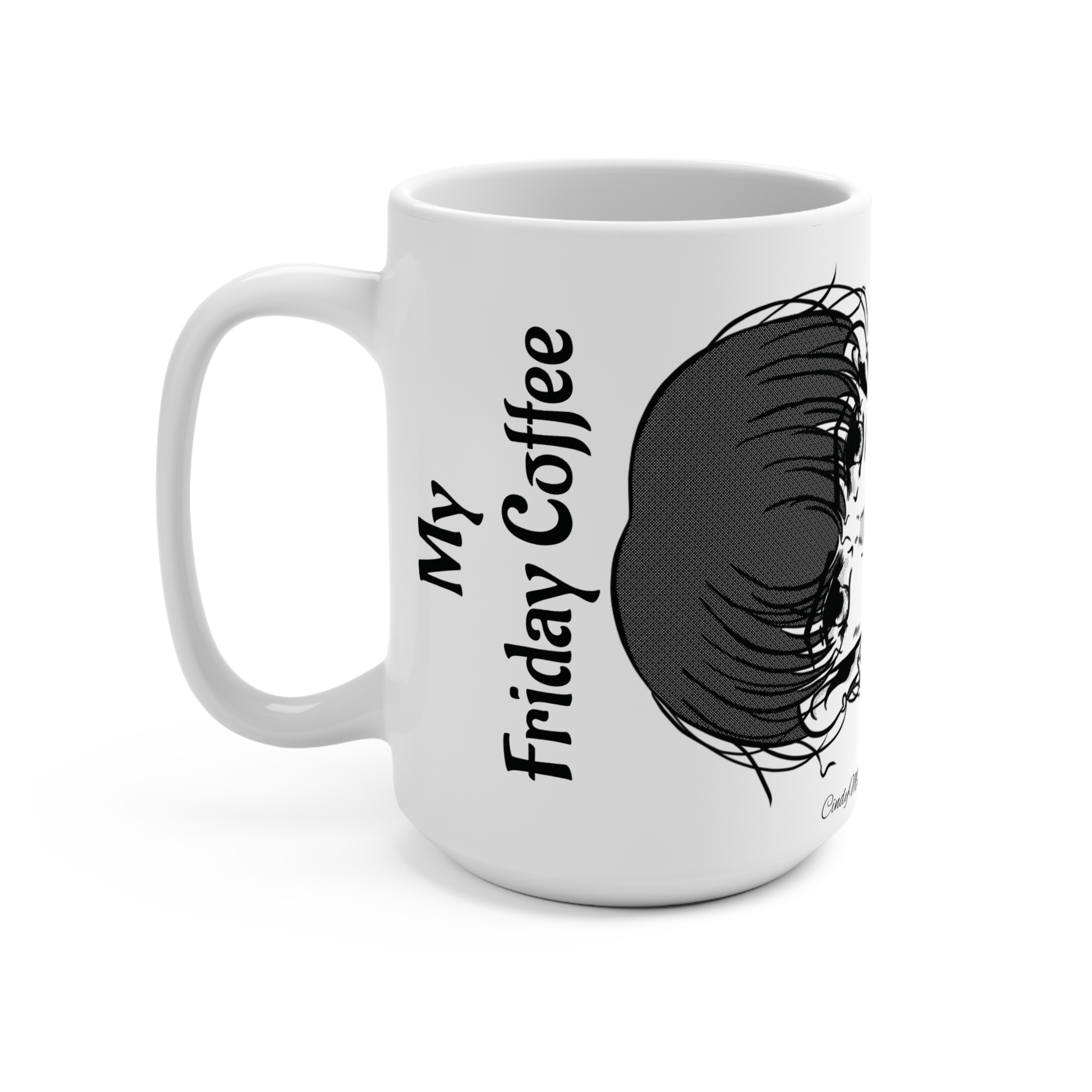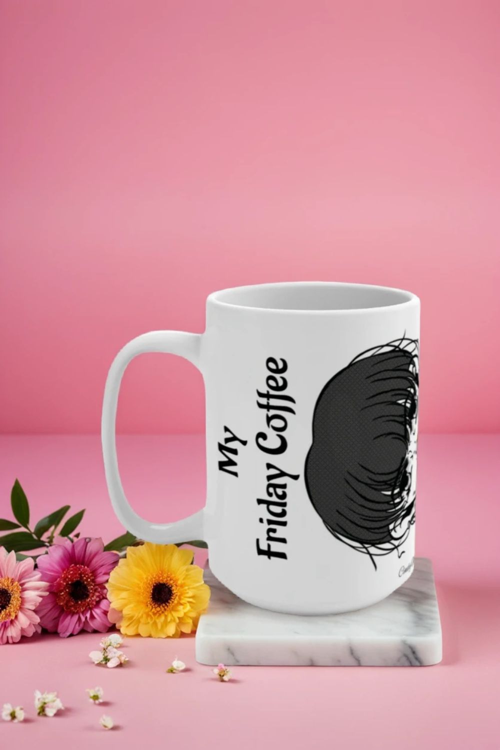 Crafted from high-quality white ceramic with a glossy finish, this mug is designed for comfort and durability, whether you’re sipping your coffee, tea, or relaxing at home. The Friday Mug’s generous 15oz size and sturdy design make it perfect for those who like their beverages with a bit of drama.