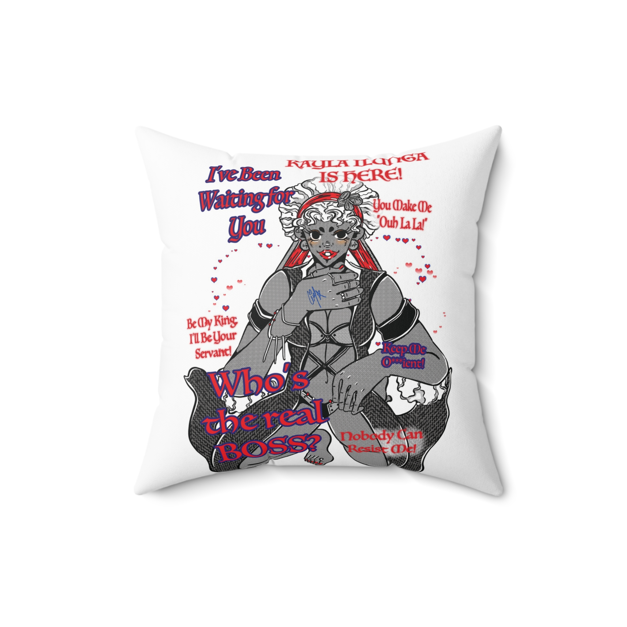 This square home decor cushion captures Kayla’s magnetic presence in black and white, with striking red accents that showcase her seductive personality. Confident and captivating, Kayla teases you with phrases like: “I’ve Been Waiting for You.” The monochrome palette keeps the indoor pillow refined, while the red detailing adds intensity and romance without overwhelming your interior.